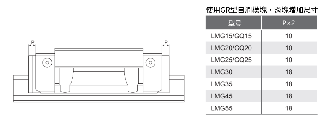 ※請留意裝有自潤模塊的滑軌加長尺寸P值,是否符合您的空間使用。